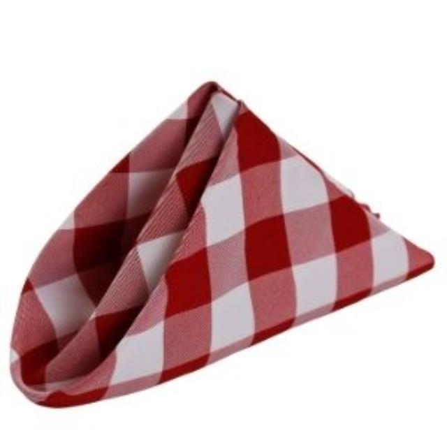 * Please call us with questions about our 20 inch x 20 inch red/white check napkin rentals, serving Fresno CA, Clovis, and the Central Valley of California.
